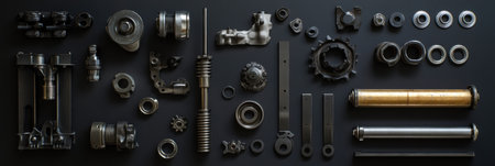 A captivating flat lay of industrial components showcases the beauty of design with an elegant arrangement of various pieces on a dark background.