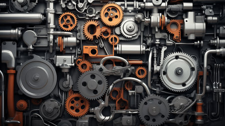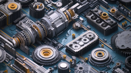 Metallic machinery interlocked in teamwork, turning with precision and strength generated by artificial intelligence