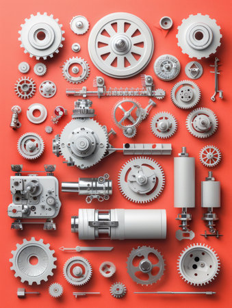 A comprehensive layout of industrial machinery components showcases the complexity and precision of modern engineering. Perfect for manufacturing themes.