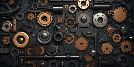 Metal Parts Abstract Background -a visually captivating composition of intricate metal parts, forming an abstract pattern that exudes a sense of industrial mechanical complexity. AI Generative AI