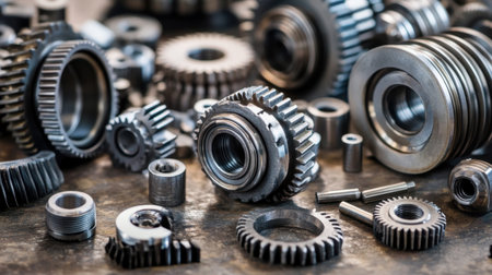 A close-up view of various metal gears and machinery components on a workbench, showcasing intricate details suitable for industrial and engineering projects.
