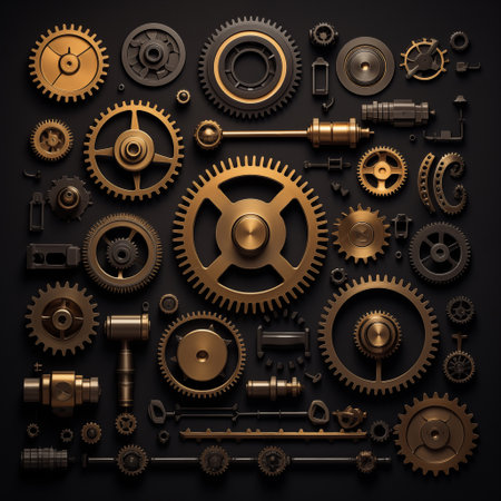 A striking collection of metallic gears and cogs arranged on a dark backdrop, emphasizing intricate mechanical details and industrial charm perfect for artistic or engineering projects.