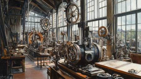 A stunning view of a vintage industrial workshop filled with intricate machinery and large windows that allow natural light to enhance the workspace atmosphere.