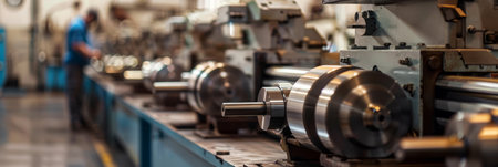 A row of industrial lathes turning and shaping metal rods, with a blue-collar worker overseeing the process. Generative AI