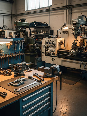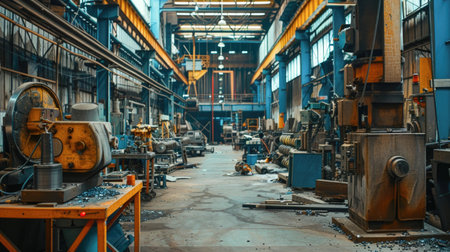 A vibrant industrial workshop interior featuring various tools and machines designed for craftsmen and artisans. This well-lit space showcases creativity and craftsmanship, perfect for projects ranging from woodworking to metalworking. Ideal for professionals seeking inspiration or resources.