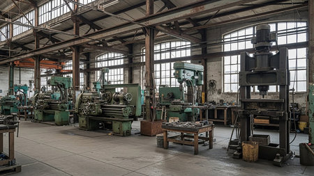 Abandoned showing vintage industrial workshop with lathe machines and sunlight rays keywords: industrial, workshop, factory, vintage, retro, machinery, lathe, metalworking, manufacturing,...