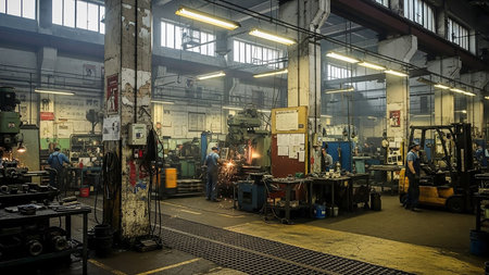 An interior view of a busy industrial factory workshop. Several workers are visible operating machinery, with sparks flying from a welding station. Various industrial equipment, tools, and a forklift are present. The space is large with high ceilings, exposed beams, and fluorescent lighting.