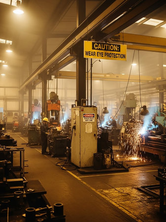 Interior view of a busy industrial factory with workers welding, sparks flying, and prominent caution signage indicating safety requirements.