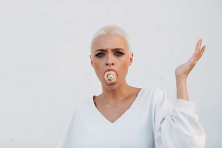 Portrait of young smiling millenial european short haired woman with sushi Philadelphia salmon roll in her mouth . Beautiful happy blonde girl outdoor.