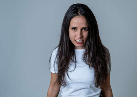 Close up of young attractive frustrated latin woman in stress with furious face. Looking mad and disappointed making angry gestures. In neutral background. In human facial expressions and emotions.