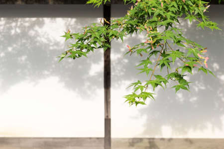 A branch of a japanese maple tree with green leaves hanging in front of a white wall with brown wooden beams