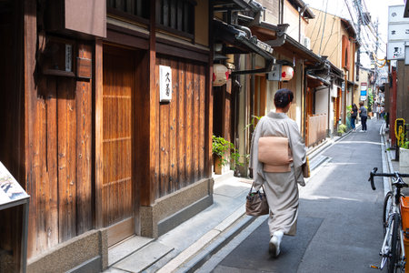 Kyoto, Japan - June 12, 2017: A lady in traditional kimono walking in a alley of the ancient Ponto-Cho district