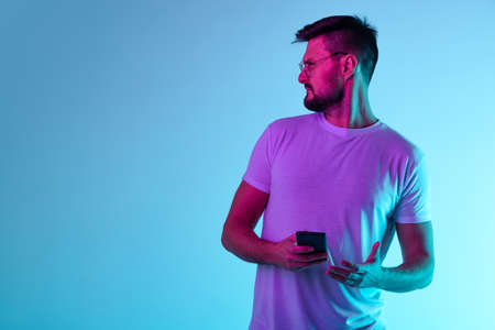 Cropped portrait of man holding phone and inquiringly looking leftside isolated over blue background in neon lights