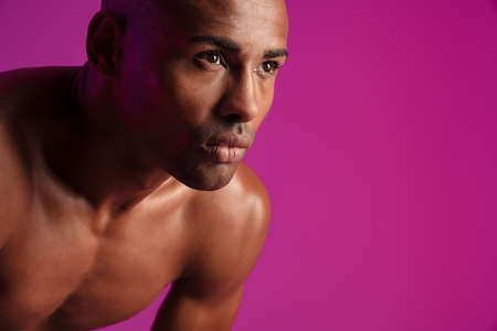 Image of a handsome strong african fitness sports man posing isolated over pink wall background