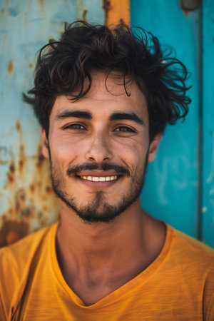 Close-up of a cheerful young adult enjoying the city ambiance with a warm, candid smile at dusk