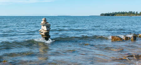 Pyramid of stacked stones are washed by the blue waves of Lake Baikal at summer sunny day, beautiful scenic seascape, stability, balance and harmony concept, banner image