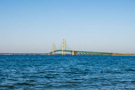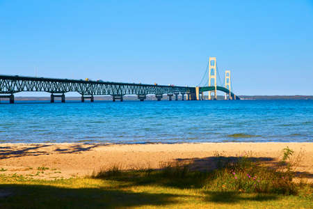 Mackinac Bridge from Mackinac City park beach Lake Huron
