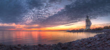 Panoramic view of beautiful sunset with scarlet clouds above the Gulf of Finland