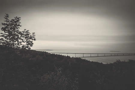 Stormy skies over Lake Michigan with the Mackinaw Bridge in the background. Wilderness State Park. Mackinaw City, Michigan.