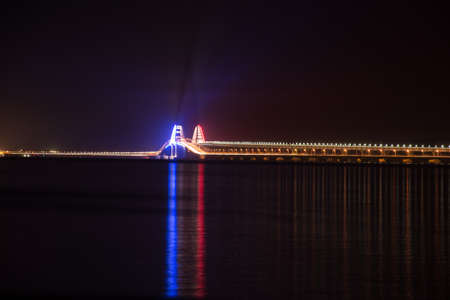 Straits of Mackinac at sunset with the Mackinac Bridge at the horizon