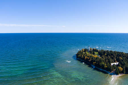 The famous Cana Island lighthouse located next to lake Michigan in Door County Wisconsin with a drone.