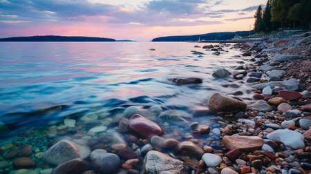 Gentle waves ripple over smooth stones on a tranquil lakeshore under a clear blue sky. The sun casts a warm glow, creating a peaceful atmosphere.