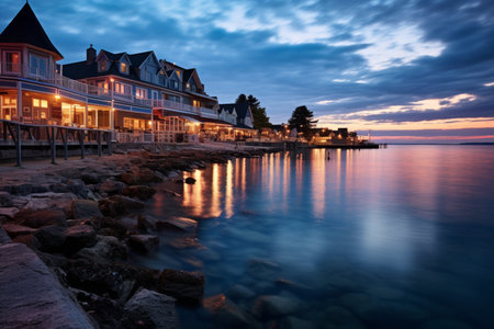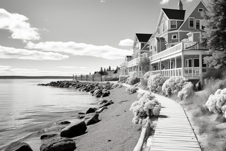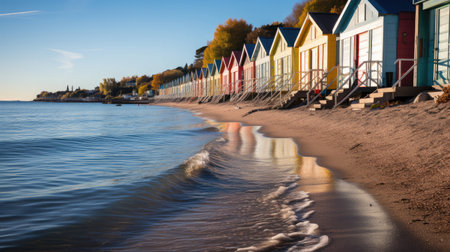 A picturesque coastal view with a row of beach huts, their colorful facades reflecting on the calm sea.