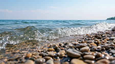 Explore the beauty of a serene shoreline where gentle waves meet pebbly sand under a clear sky, creating a tranquil atmosphere perfect for relaxation and contemplation.