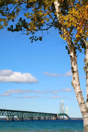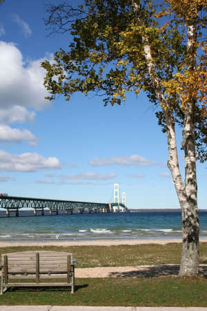 The Coast of Lake Huron, at the Straits of Mackinac, with the Mackinac Bridge during Autumn, Michigan, USA