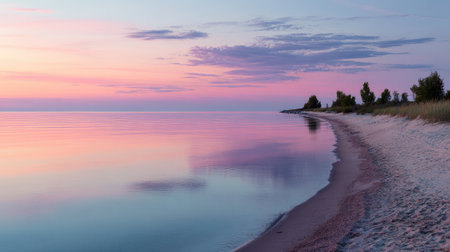 Captivating view of a calm beach at sunset, showcasing beautiful reflections in the water and a stunning pastel sky, perfect for nature lovers and peaceful settings.