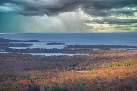 Stormy skies over Lake Michigan with the Mackinaw Bridge in the background. Wilderness State Park. Mackinaw City, Michigan.