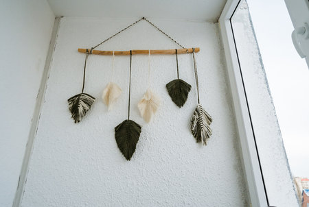 White macrame hanging on wooden plank at wall near home decor with natural materials in bohemian style. Living room with handmade knitting elements and ethnic objects