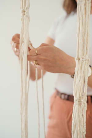 base knots of macrame, the view from behind the shoulder close-up of the women hands, she ties knots. ECO friendly modern knitting DIY natural decoration concept.