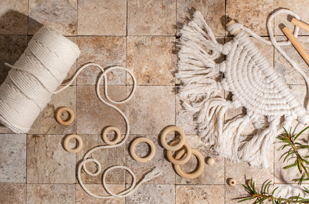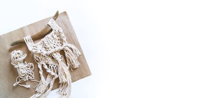 Macrame accessories on white concrete background. Creative hobby concept. Top view
