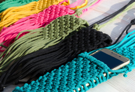 Small handbag for a mobile phone. Knitting macrame, pattern of multi-colored cotton cords. Handmade concept, hobby, background, fashionable online knitting course.