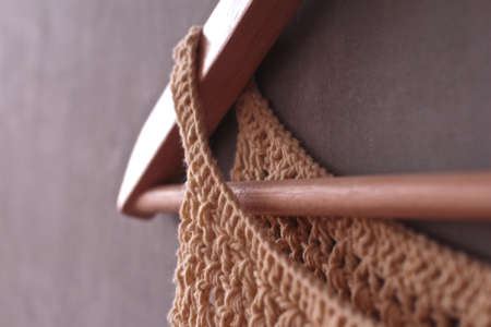 Handmade macrame shopping bag on brown wall, space for text