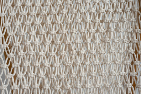 Close-up of handmade macrame texture sample. Eco-friendly modern DIY knitting concept for natural decor in the interior. Handmade macrame from 100 cotton.