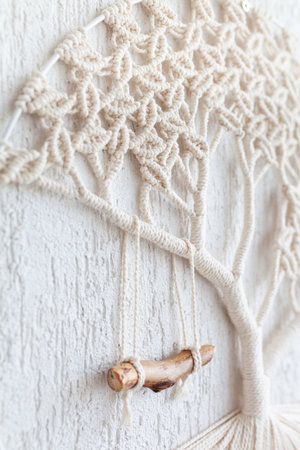 Macrame weaving from natural cotton threads. Home decor vintage boho style. Decorative panel on a wooden branch. Natural
