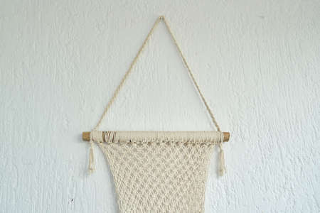 A macrame the art of knotting cord or string in patterns hanging on white cement wall for home and wedding decoration with copy space