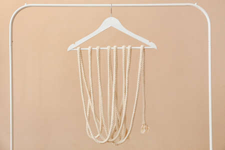 Rack with clothes hanger and rope on light background