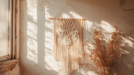 A textured wall hanging made of knotted cords displays complex geometric designs in soft beige colors adding warmth to the decor.