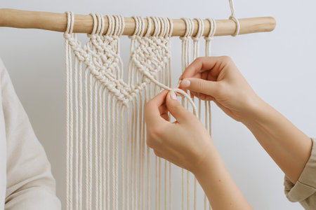 Hands creating macrame on wooden stick in cozy setting. concept of crafting, handmade decor, creative relaxation.