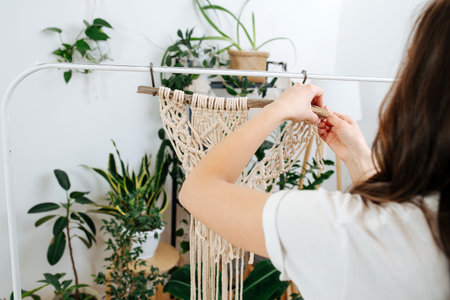 Brunette woman working on a unfinished section of a macrame piece, weaving ropes inside a home greenhouse room next to lots of potted plants. Cropped. From behind.