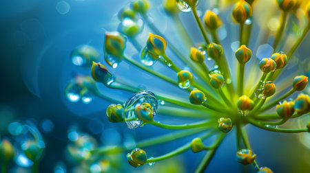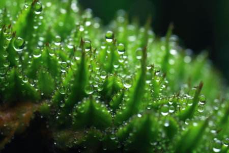 A close-up shot of fresh green plant buds with water droplets glistening in the sunlight, creating a vibrant and refreshing scene.