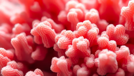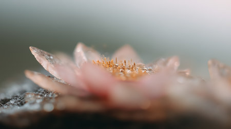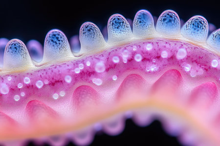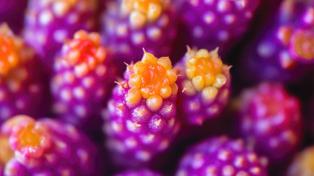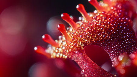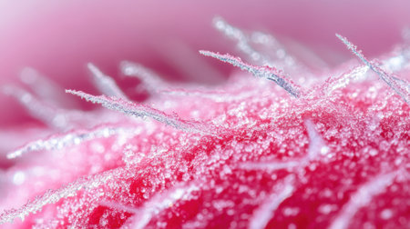 Macro photography of raspberry surface with sparkling ice granules and delicate hair textures under magnification