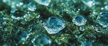 Close-up view of dew drops glistening on blades of grass in a tranquil morning setting