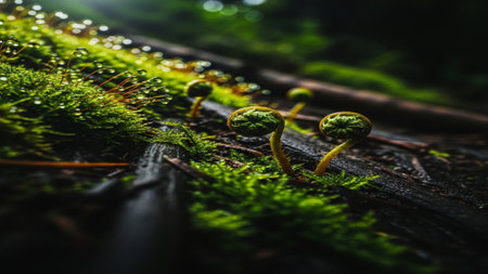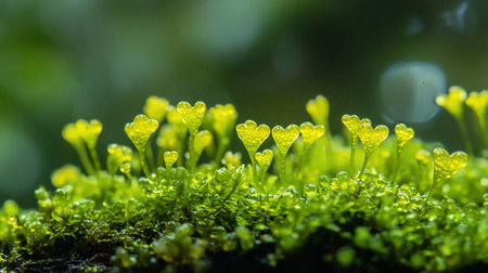 A macro shot reveals heart-shaped slime mold growing on lush green moss, set against a blurred green background, showcasing nature's intricate details and textures.