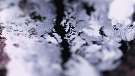Ink drip. Paint liquid spill. Defocused black white red color stain acrylic dye blot pigment splash emulsion fluid leak glass cube abstract art background.