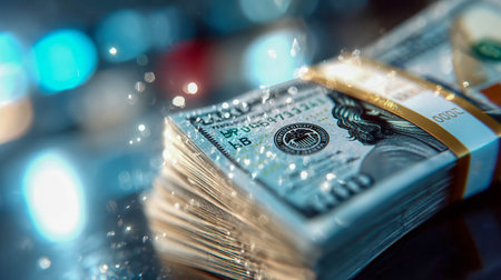 Close-up of a stack of hundred-dollar bills with glowing light effects symbolizing wealth, finance, and prosperity.
