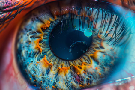 A close up of a person's eye with a blue iris and orange and yellow lines